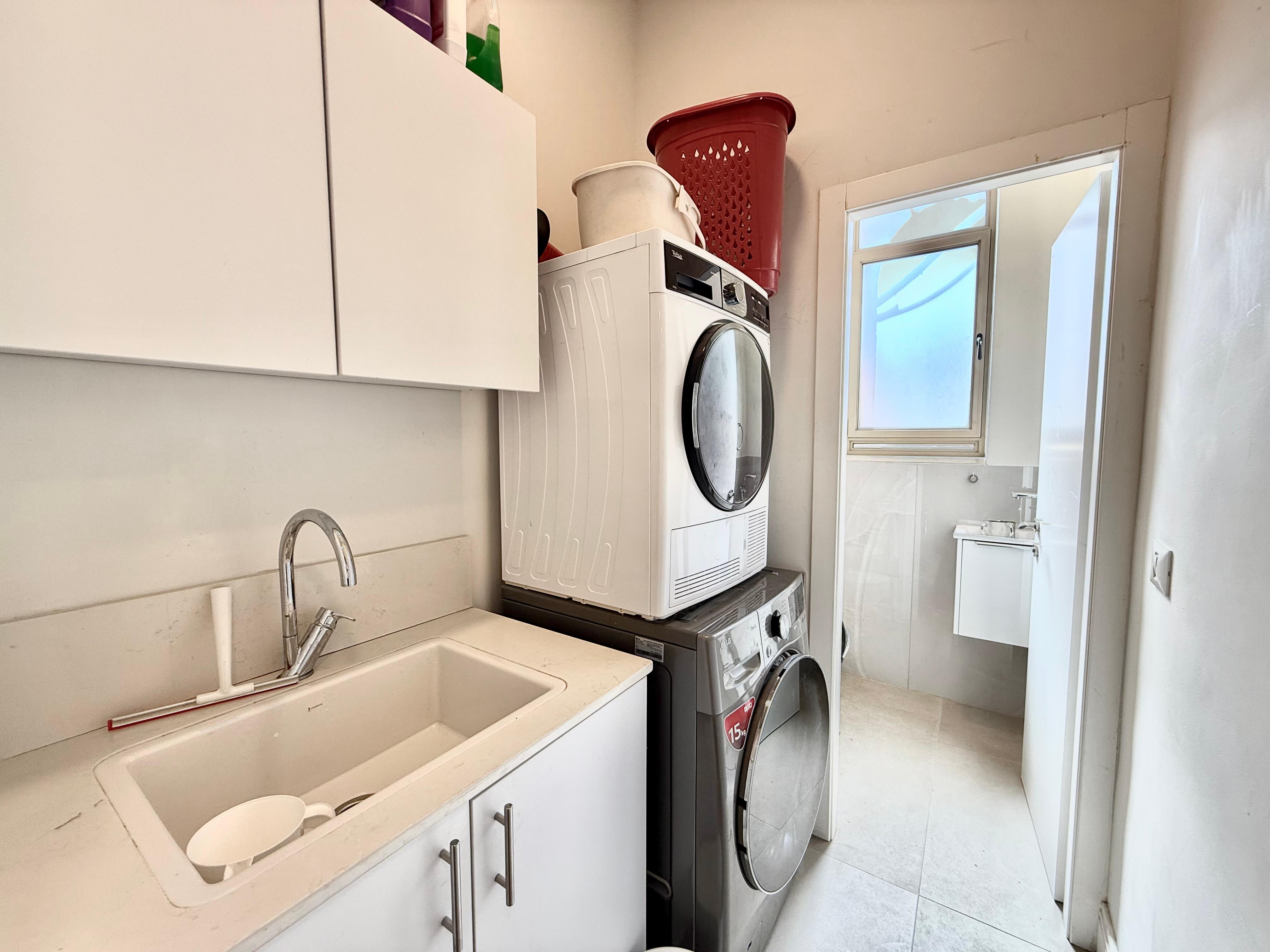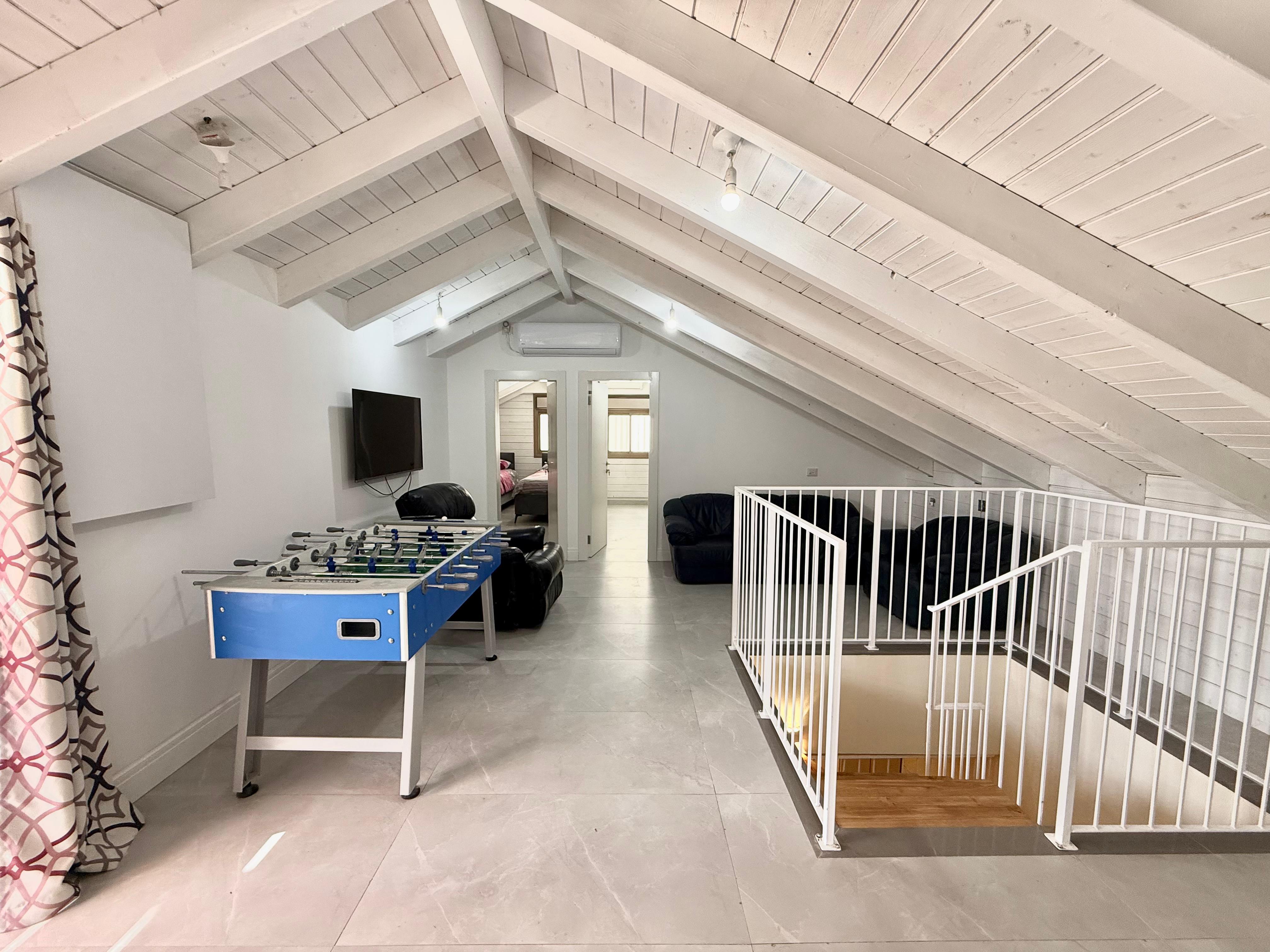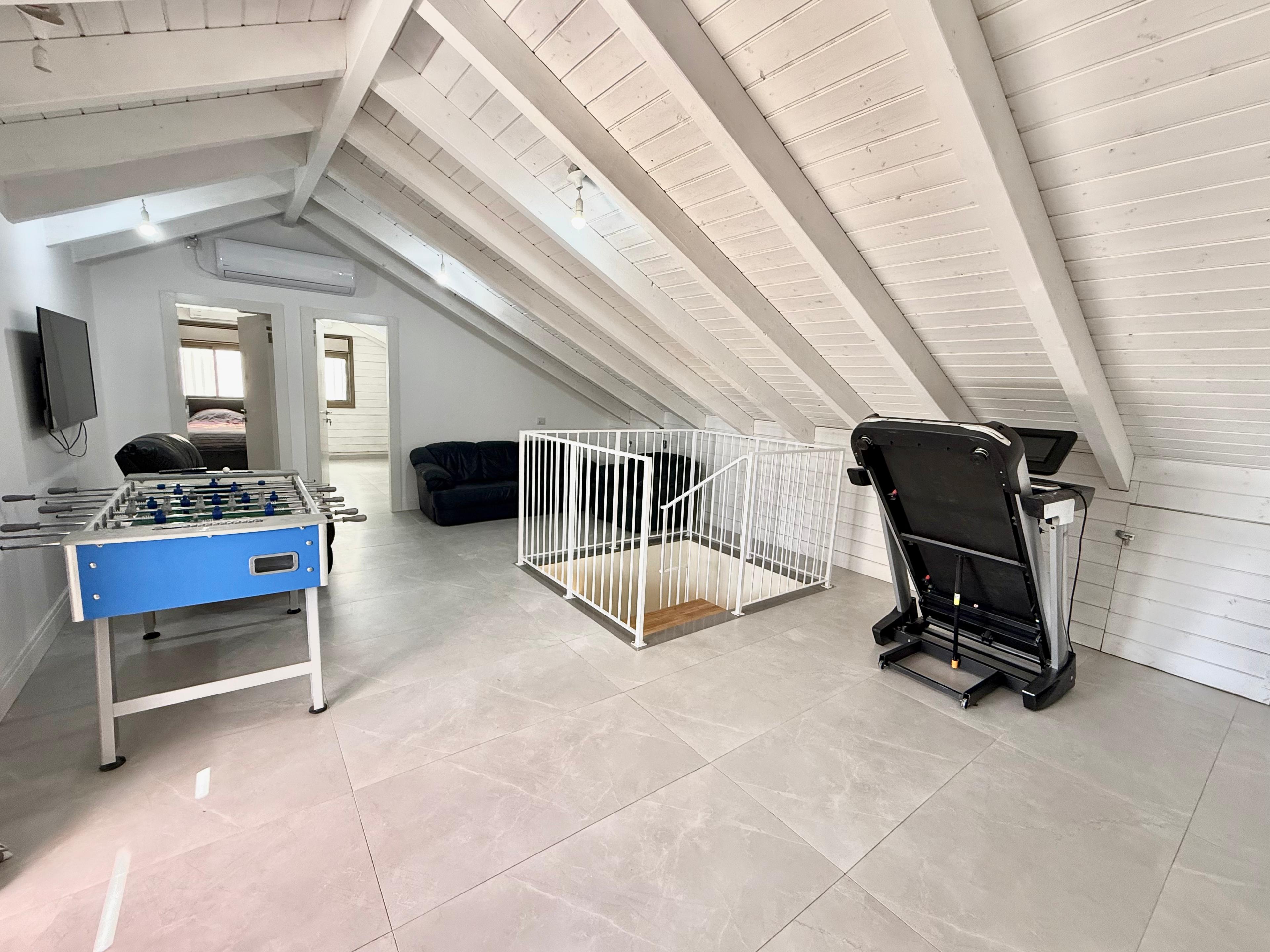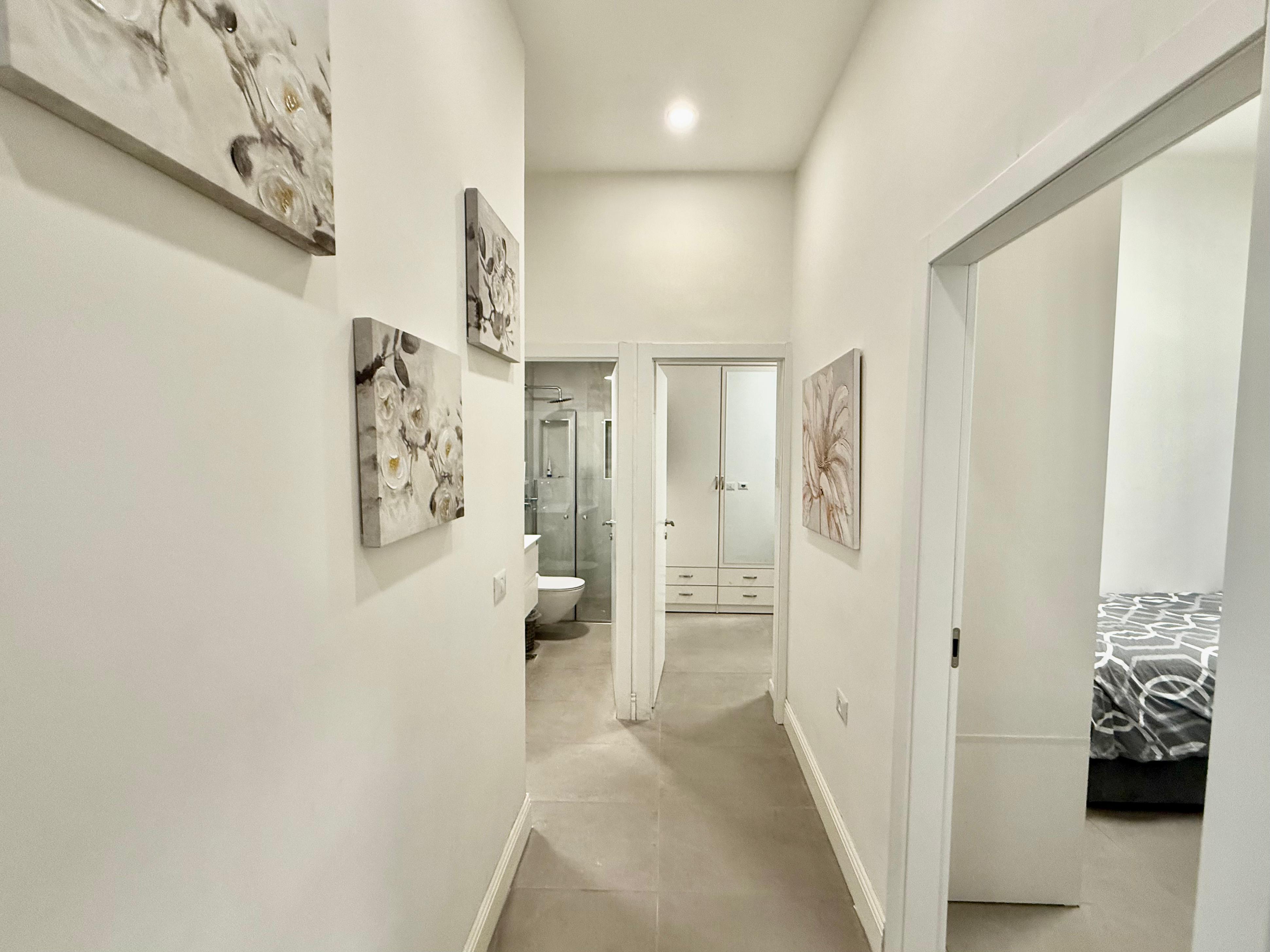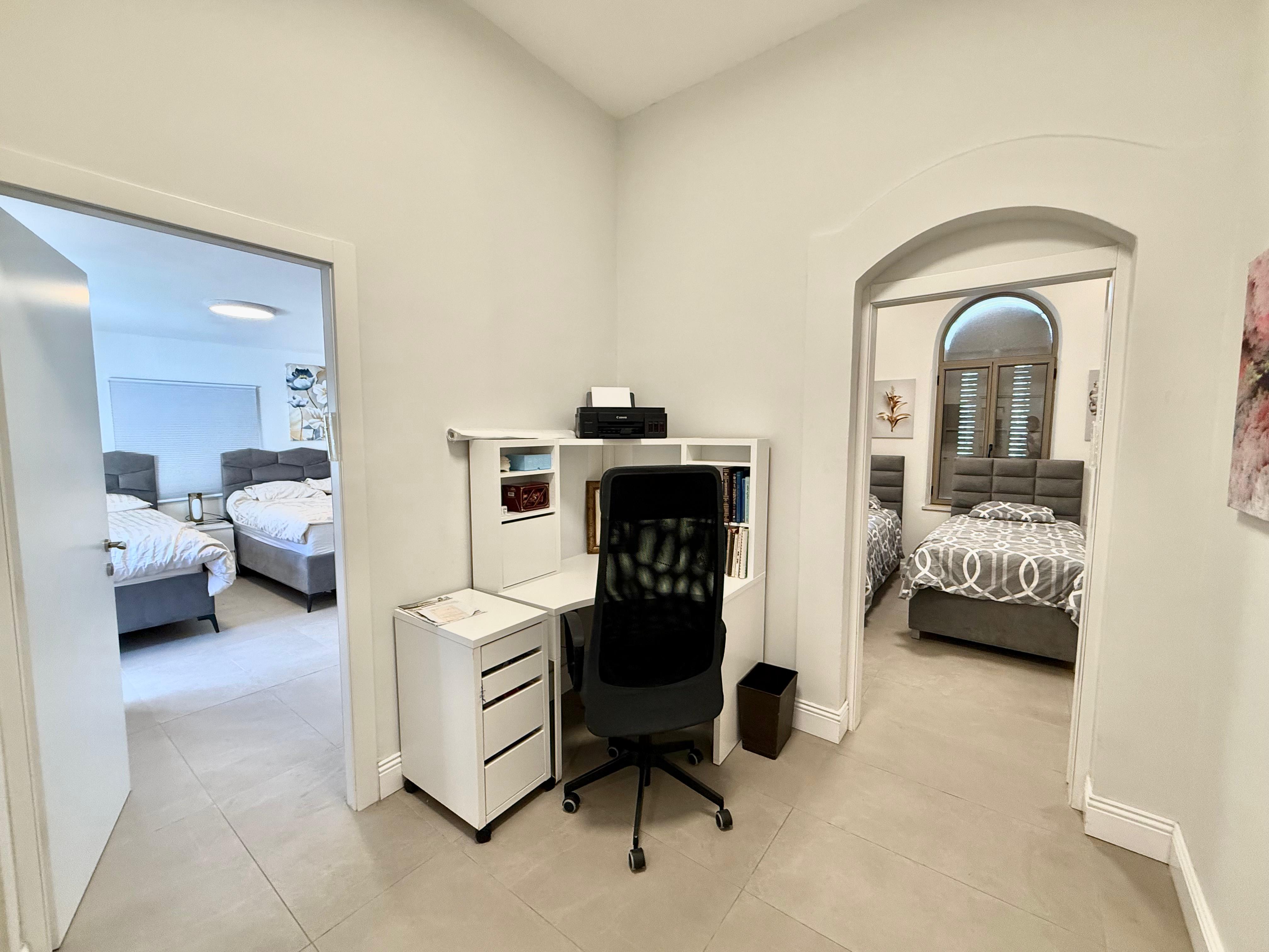 This luxurious 8 bedroom apartment is located in the heart of Geula. The apartment has a set of stairs that leads into the first level floor that holds a powder room that connects to a laundry room, a large long dining room table that seats up to 12 people, a nice size fully equipped kitchen with marble counter tops and white cabinets, and a large comfortable living room area with 1 large couch and 2 large cushioned chairs. Throughout the apartment there is underfloor heating. The first level floor also holds 6 bedrooms, 2.5 bathrooms and a long narrow balcony connecting with two of the bedrooms, as well as another balcony off another bedroom. Underfloor heating and hot water unit included. There is a Beautiful chic swirl staircase that leads to a hang out area, where the final two bedrooms, and a full bathroom is situated.