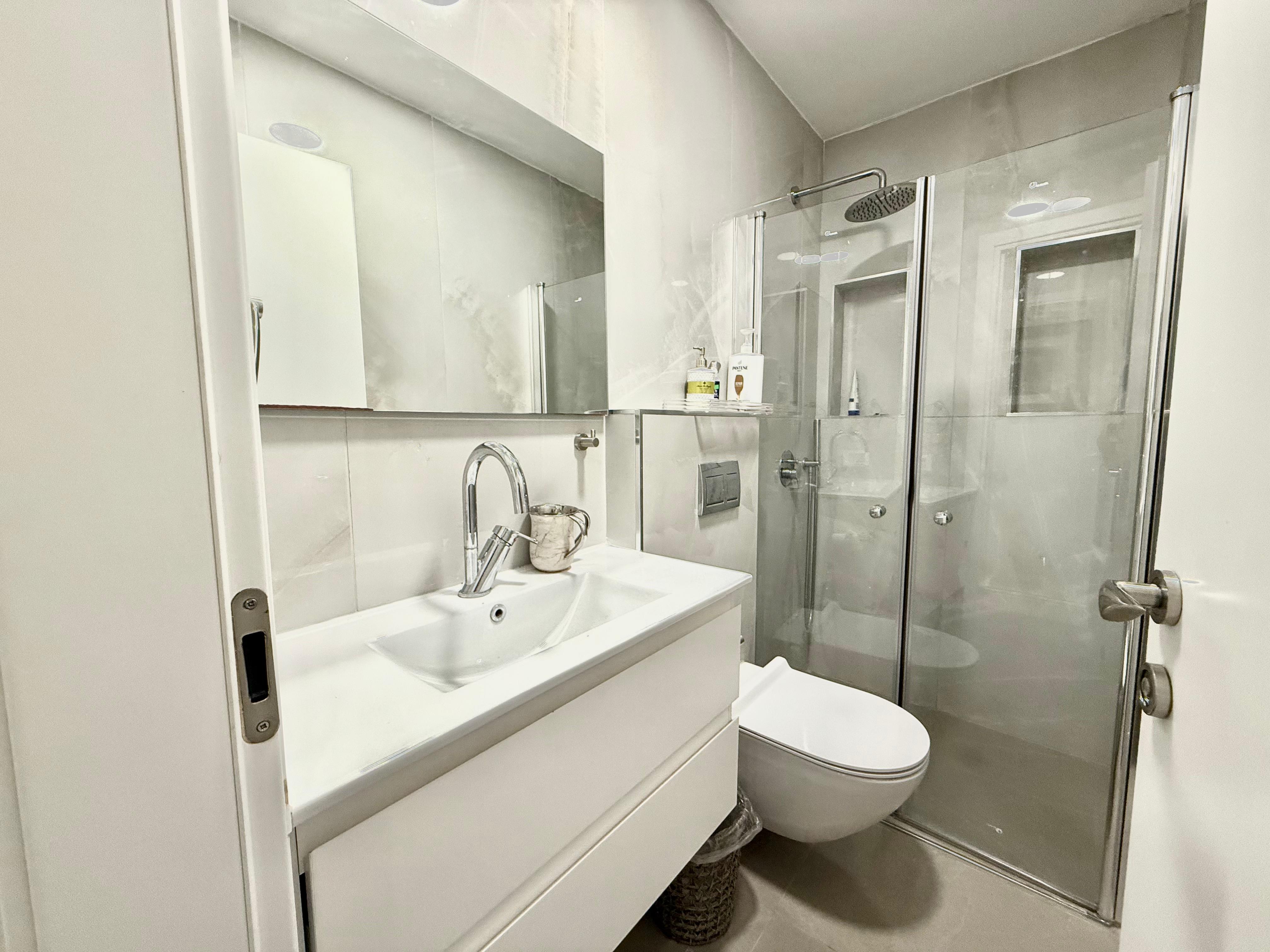 Ground FloorThe third bathroom is a full guest bathroom with a walk-in shower, sink, and toilet.