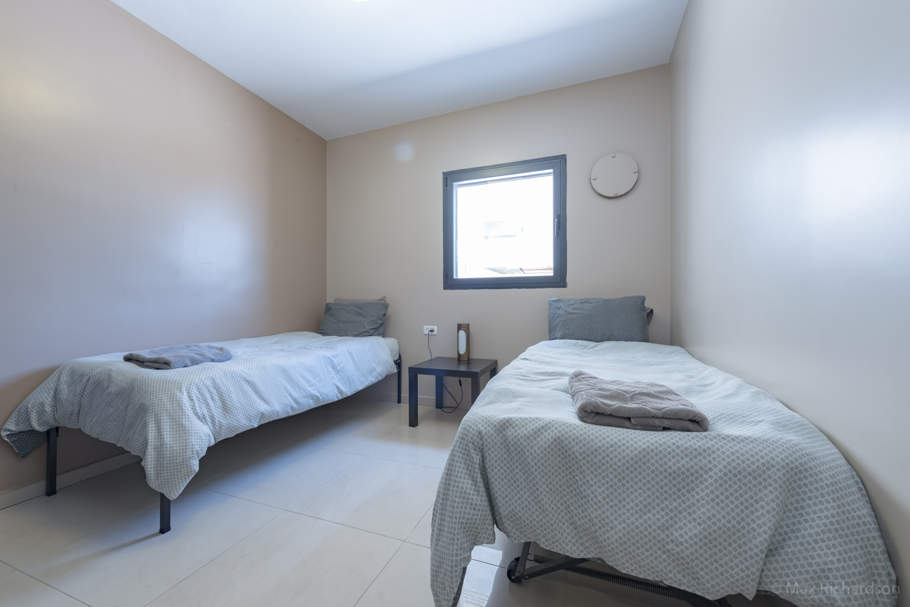 2Twin Sized Beds The first bedroom is the master en-suite bedroom. There are two American-style twin-sized beds and closet space.