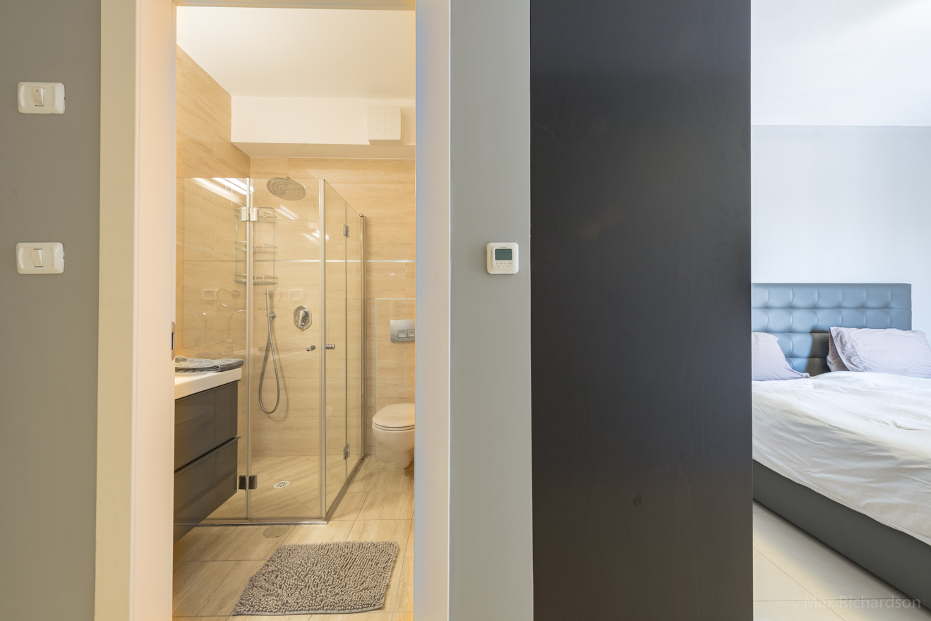 The first bathroom is the master en-suite bathroom with a walk-in shower, sink, and toilet.