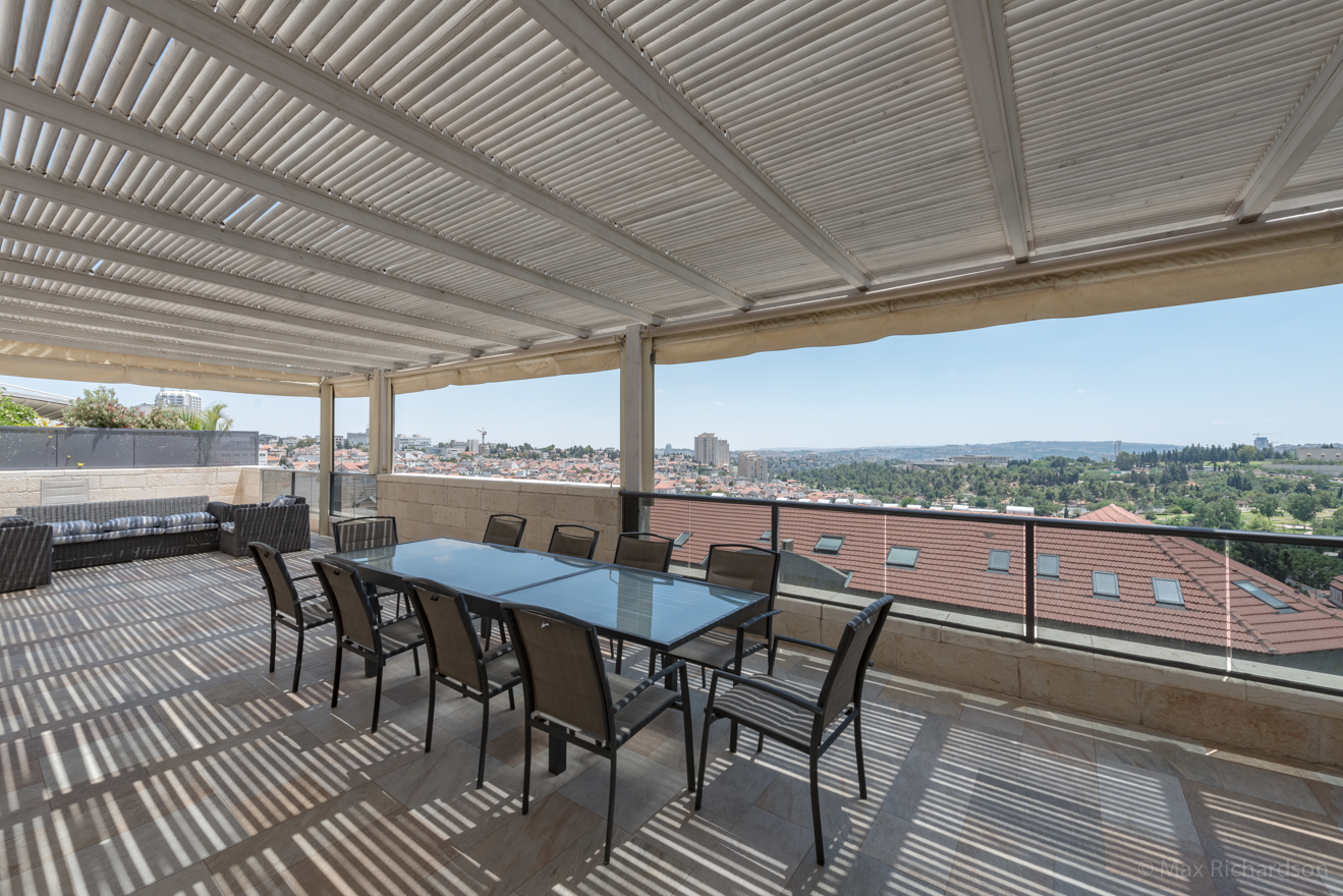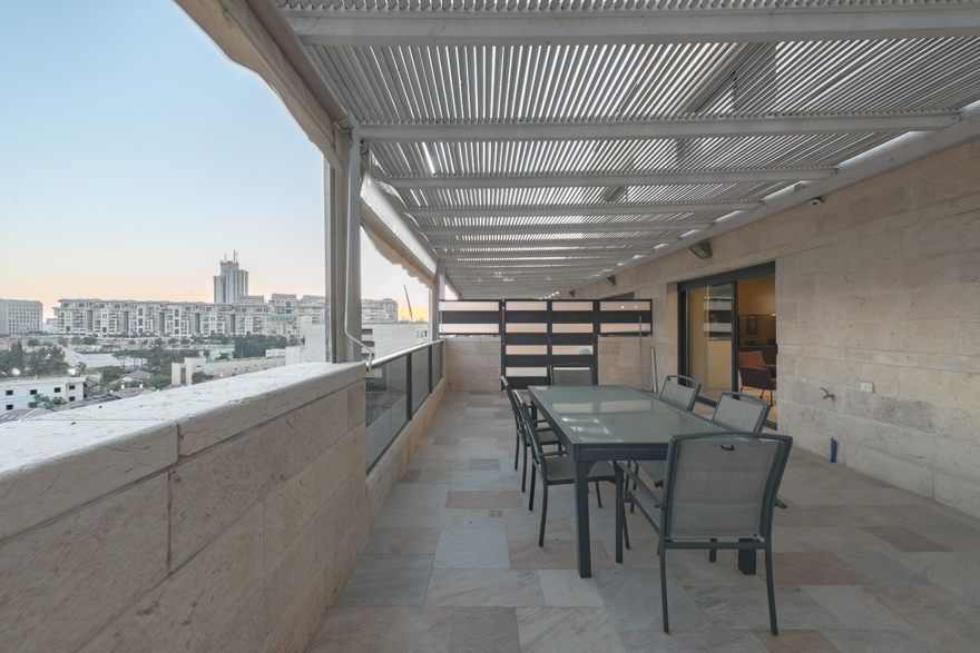 Beautiful and bright apartment in central location in the heart of Jerusalem. Stunning views from the over sized porch right off of living room area. Brand new Glatt Kosher and fully equipped kitchen with eating area. Comfortable bedrooms with high quality beds and bedding to make your stay even more comfortable. 172 square meter balcony. Full Amenities, like Cable TV and WIFI available at no extra charge. Enjoy your stay in Jerusalem in this great spacious apartment, BOOK NOW!