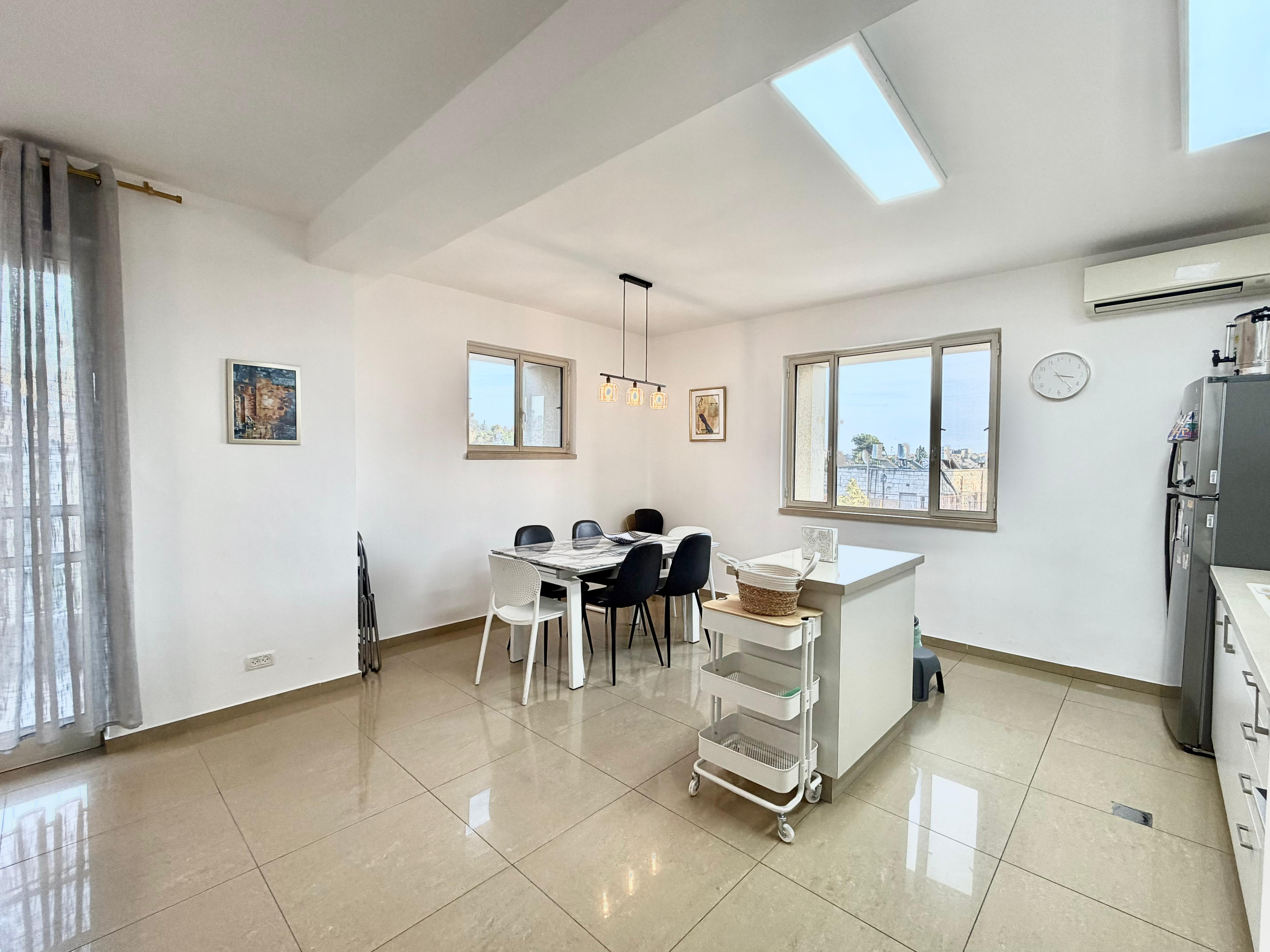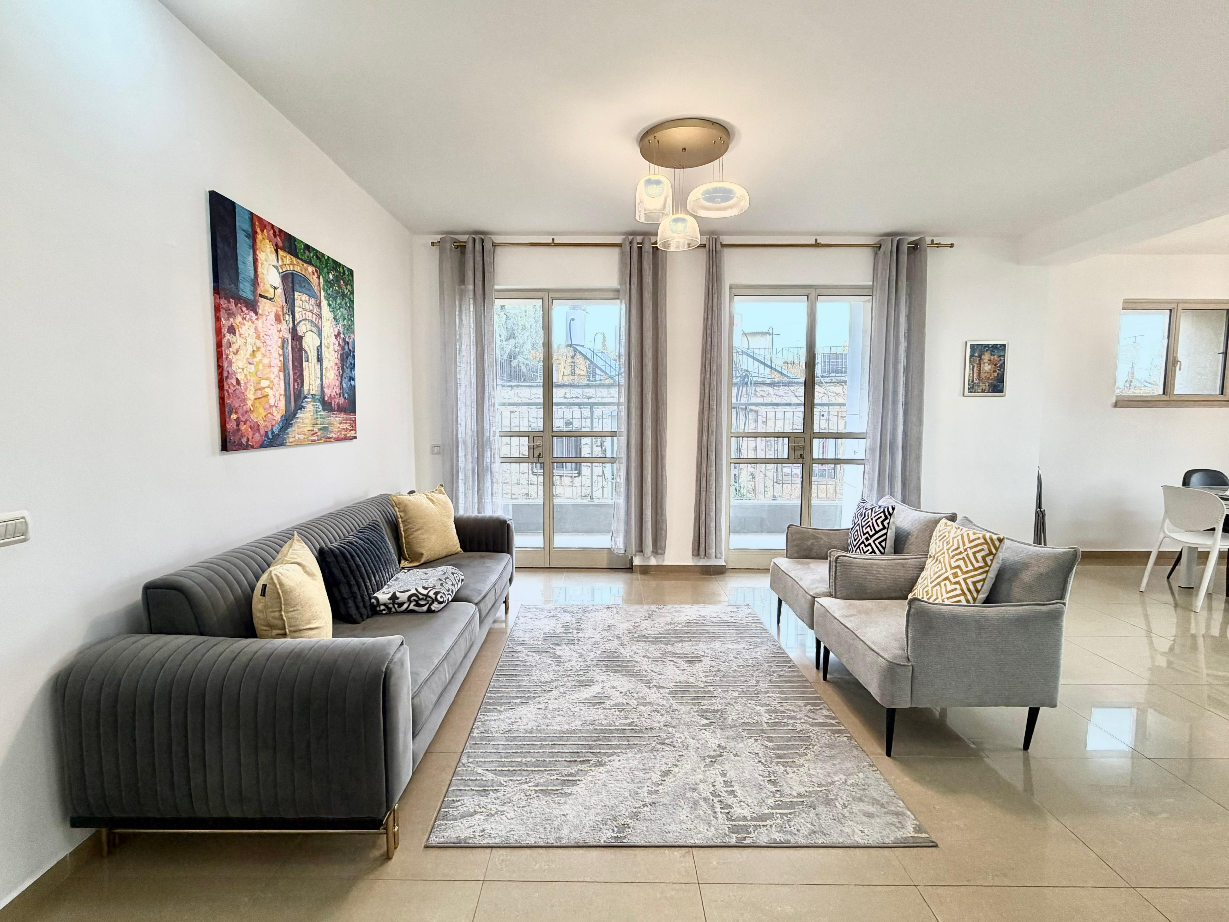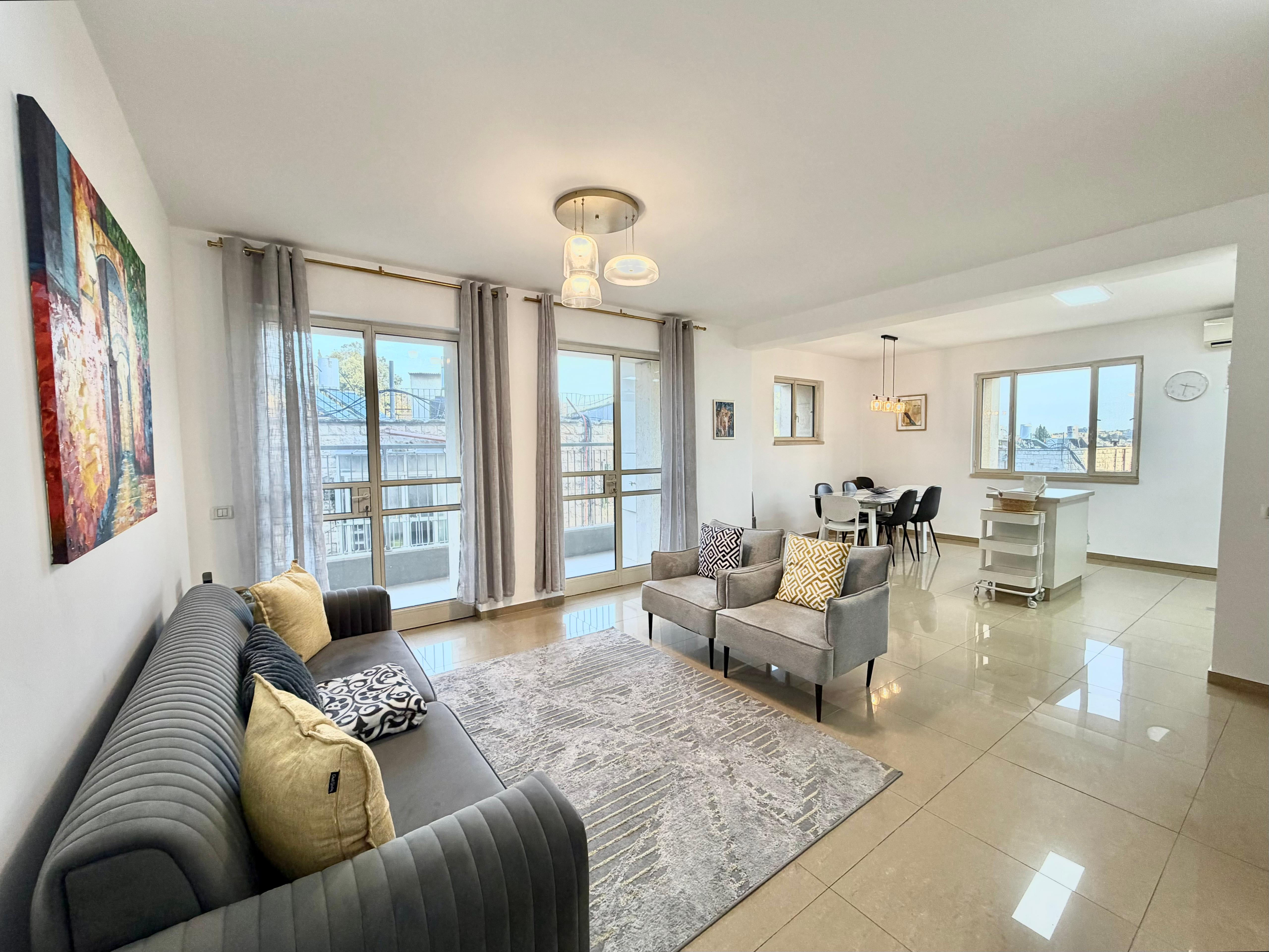 This freshly renovated, spacious and bright 3.5 bedroom apartment comes with 2 balconies and is located in Katamon. The main living area has an open floor plan with lots of sunlight from the balcony coming off of it.